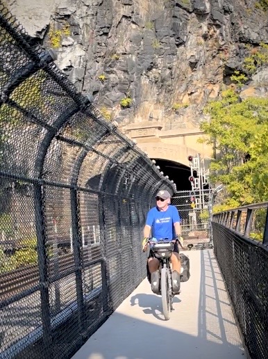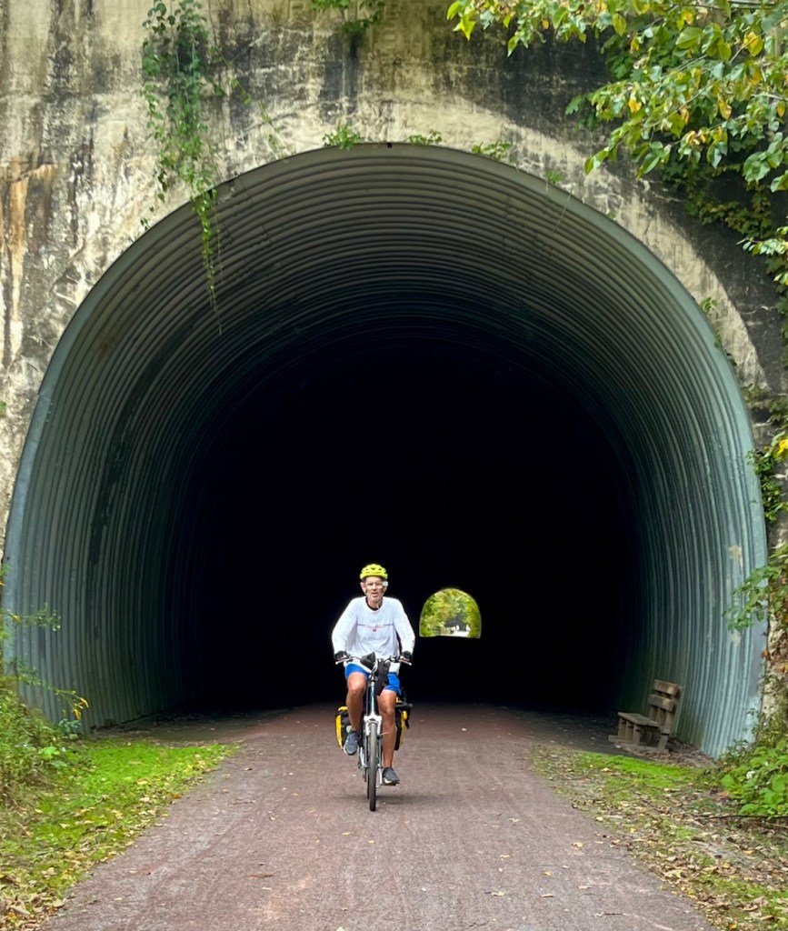 Among the most unique experiences on our route were the tunnels that cut through the hills along the C&O and GAP. The most notable of these was the GAP’s Big Savage Tunnel, a 3,291-foot project built in 1912 and refurbished in 2012. Entering the tunnel, our surroundings changed from the sunlit path to a cold, damp darkness that enveloped us. The only light came from our bike headlights, casting long, shifting shadows on the tunnel walls. Our breathing echoed in the confined space, and the sound of our tires on the wet concrete added to the otherworldly atmosphere.