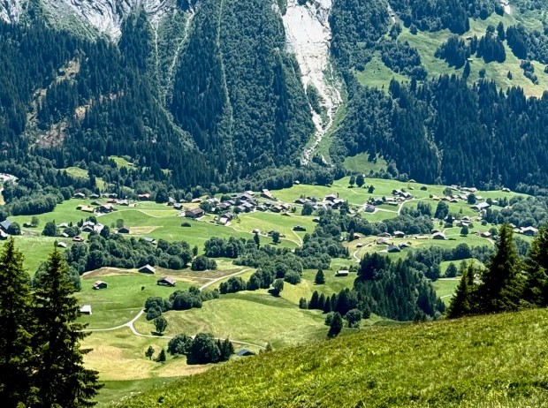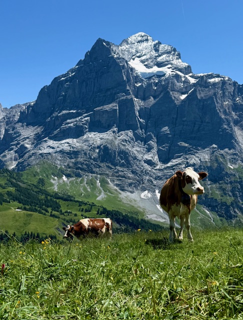 From there, we continued on to Grindelwald, and the landscape seemed to step into the realm of fantasy. Surrounded by glaciers and towering granite peaks, the village sits in a lush green basin that feels like a natural amphitheater for the Alps. We laced up our shoes and spent the day exploring the area on foot, following trails that led us past wooden chalets, flower-strewn meadows and iconic Swiss cows grazing on steep hillsides with the valley far below.