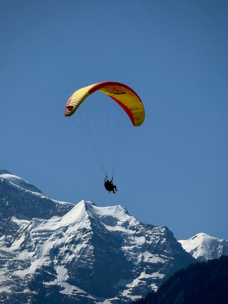 One of the most unforgettable scenes of the day was watching the paragliders. From our vantage point on the trails, we saw them drifting silently through the sky — tiny figures suspended beneath bright canopies, soaring from high alpine launch points near Grindelwald. They traced long, graceful arcs through the air, their silhouettes backlit by snow-covered glaciers. Some floated close to the cliffs while others seemed to climb higher and higher, carried on thermals that lifted them toward the jagged summits.