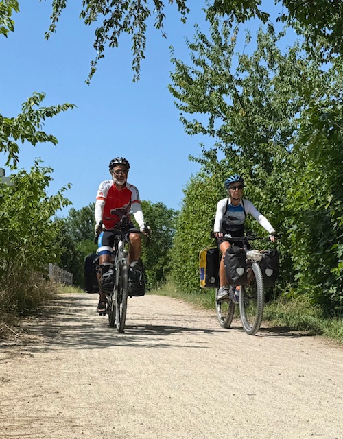 That turn proved crucial. It was the connector from EuroVelo 15 to EuroVelo 6, one of Europe’s most traveled cycling paths. A few minutes later, they stopped in a small town, and I took the opportunity to chat. Their names were Paul and Adele, seasoned touring cyclists from New Zealand.